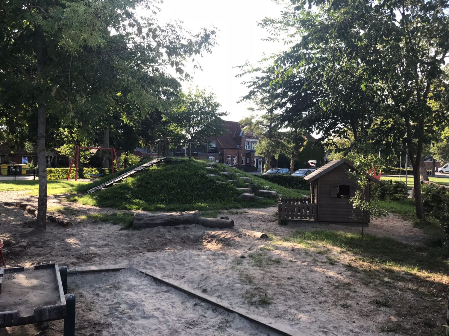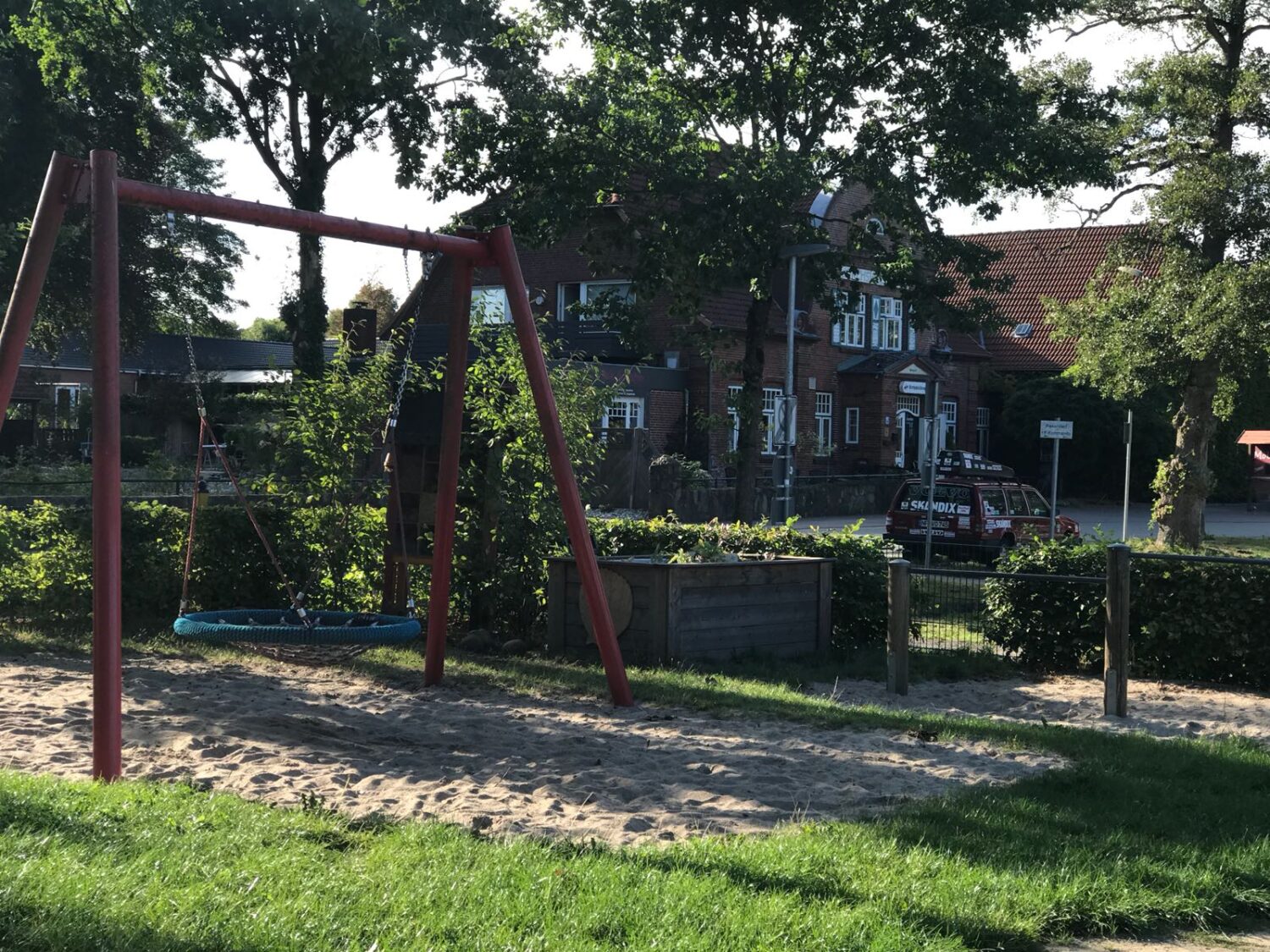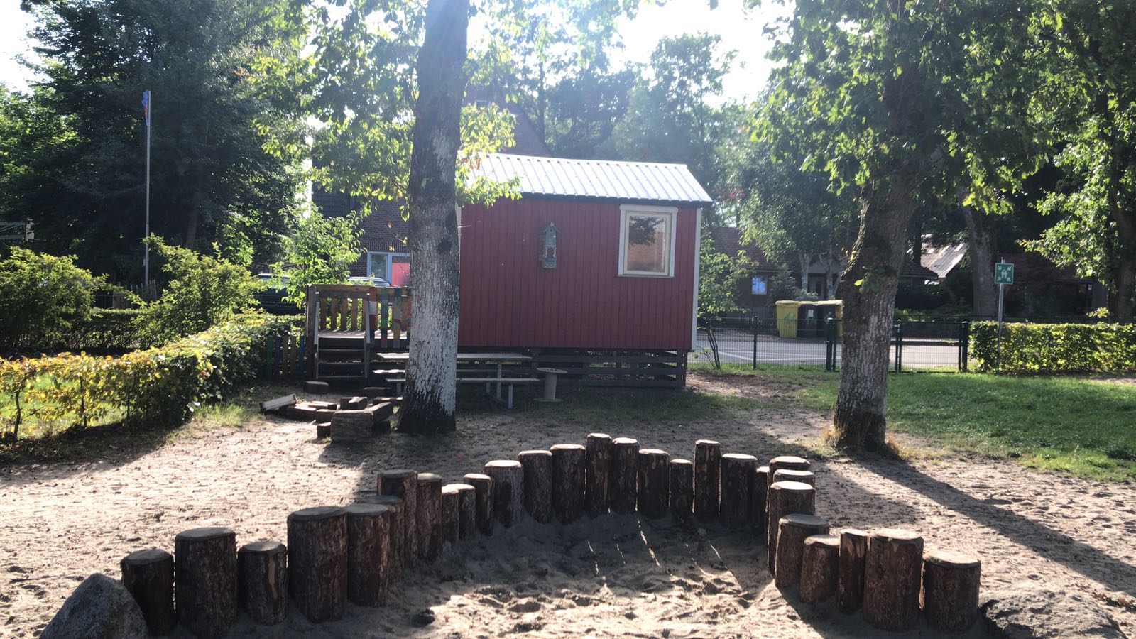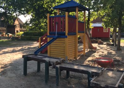 Der Garten für unsere Kleinsten ist durch einen kleinen Zaun vom Spielgelände des Elementarbereiches getrennt. Da das Spiel der jüngeren Kinder noch etwas ruhiger ist, hilft der kleine Zaun bei dem ungestörten Spiel der Jüngsten. Der Sandkistenbereich bietet Sitzmöglichkeiten am Rand und in der Mitte, von denen aus die Kinder Materialien umfüllen, transportieren und daraus etwas entstehen lassen können.