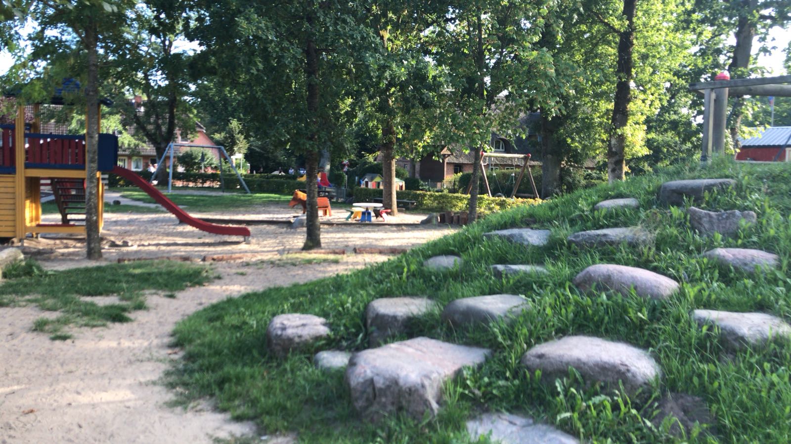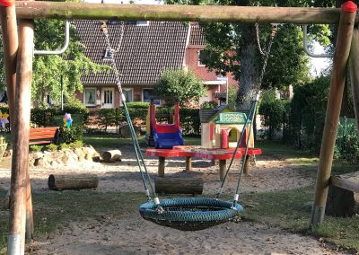 Die Nestschaukeln bieten Platz für mehrere Kinder gleichzeitig. Große wie kleine Kinder können hier ihr Gleichgewicht und ihre Koordination stärken. Ein Sonnensegel im Krippenbereich schützt im Sommer den Sandkastenbereich vor zu starker Sonnenbestrahlung. In den Spielebereichen sind Rückzugsmöglichkeiten für das Spielen allein, zu zweit oder in der Gruppe möglich. Unsere Rutschen erreichen die Kinder über eine geschlossene Treppe, die sie alters entsprechend fordern.