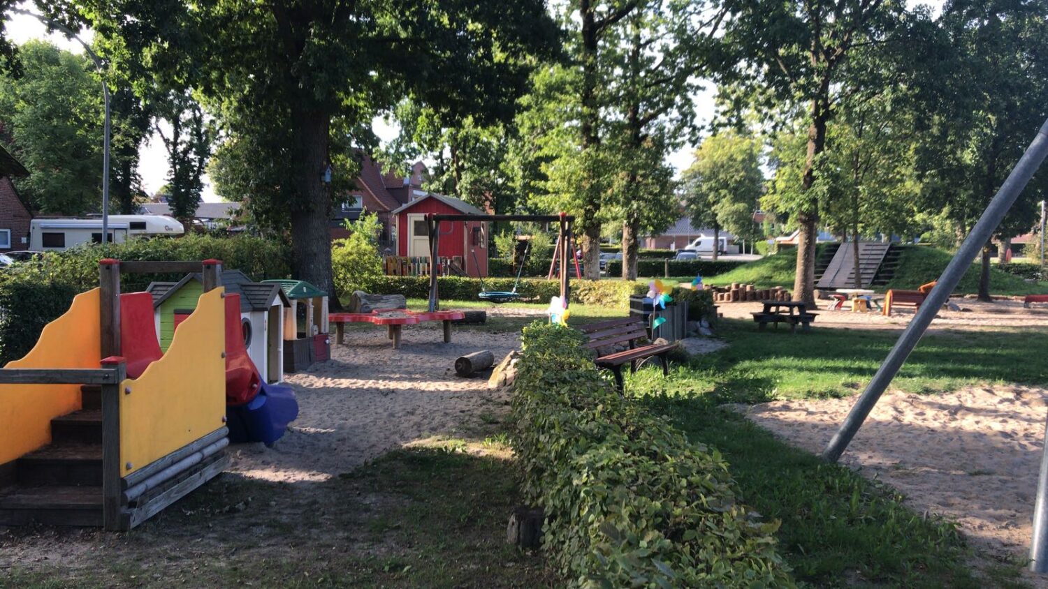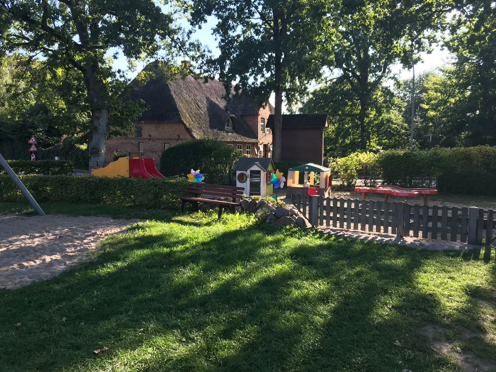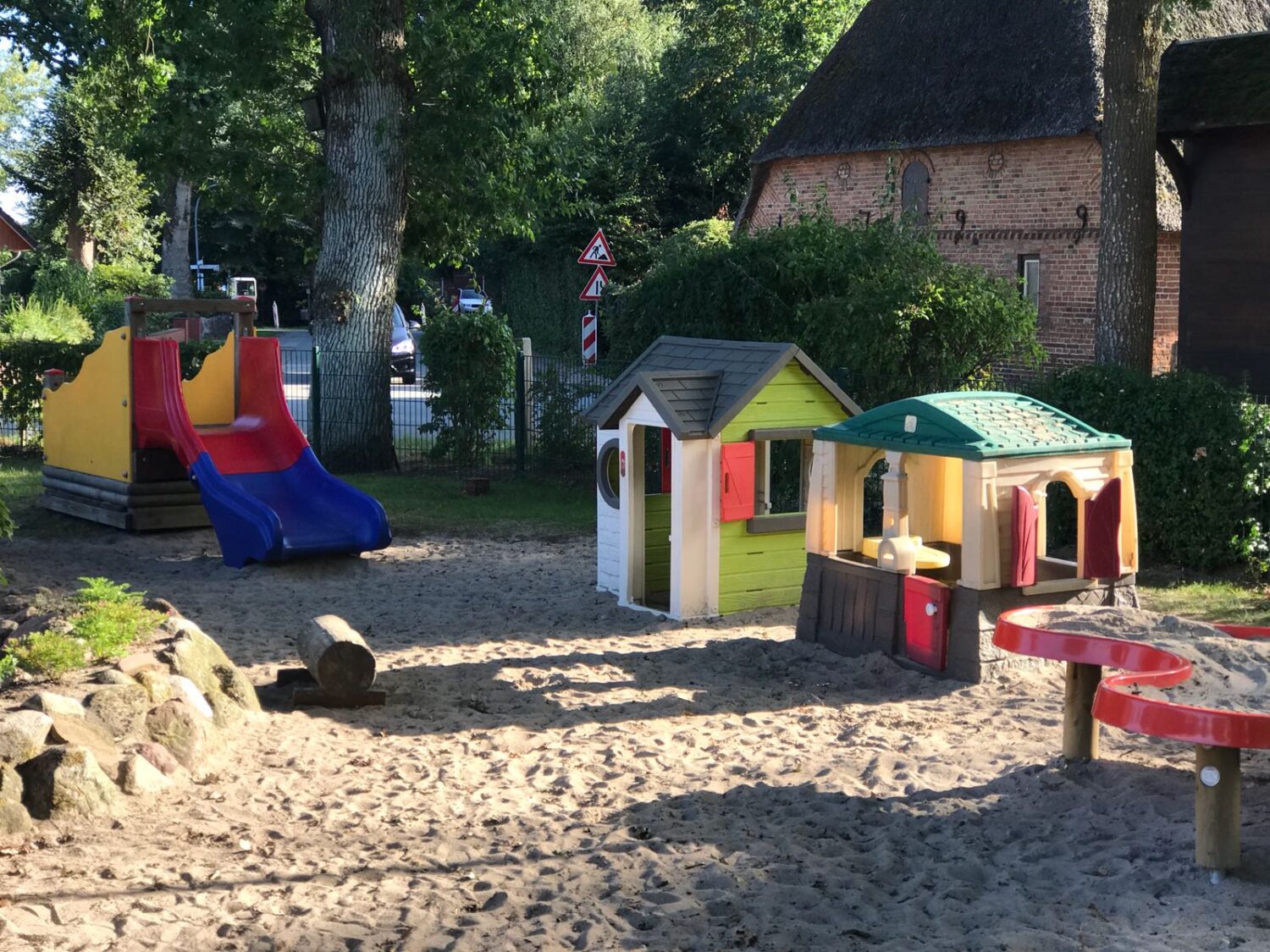 Zusätzlich zu den einzelnen Themenräumen und den dazugehörigen Waschräumen verfügen wir über einen Bauwagen, der während unseres Kitaumbaus zu unserem Werkraum wurde. Um mit den Kindern gemeinsam das Frühstück vorbereiten zu können, steht uns eine Kinderküche zur Verfügung, gegessen wird dann in unserem neuen Essensraum. Für den Bewegungsdrang unserer Kinder finden Sie außerdem ein großes Außengelände, einen abwechslungsreichen Spielplatz und einen Fußballplatz bei uns. Außerdem steht uns die Sporthalle der Grundschule Breklum an 3 festen Tagen in der Woche und viele schöne Ausflugziele unseres Dorfes zur Verfügung, z.B. Kirchenwald, Grüner Weg, Bachläufe, Kirche.