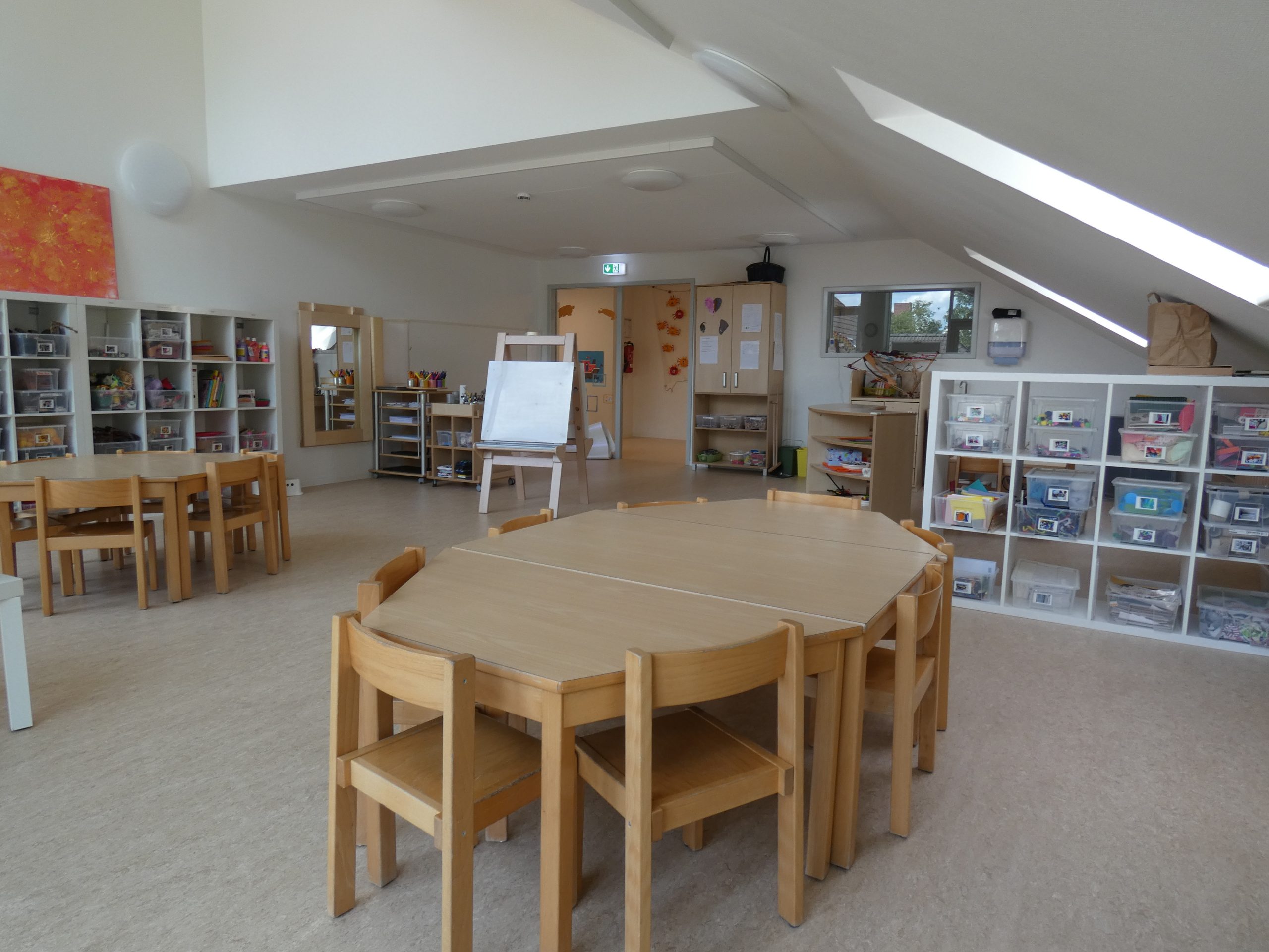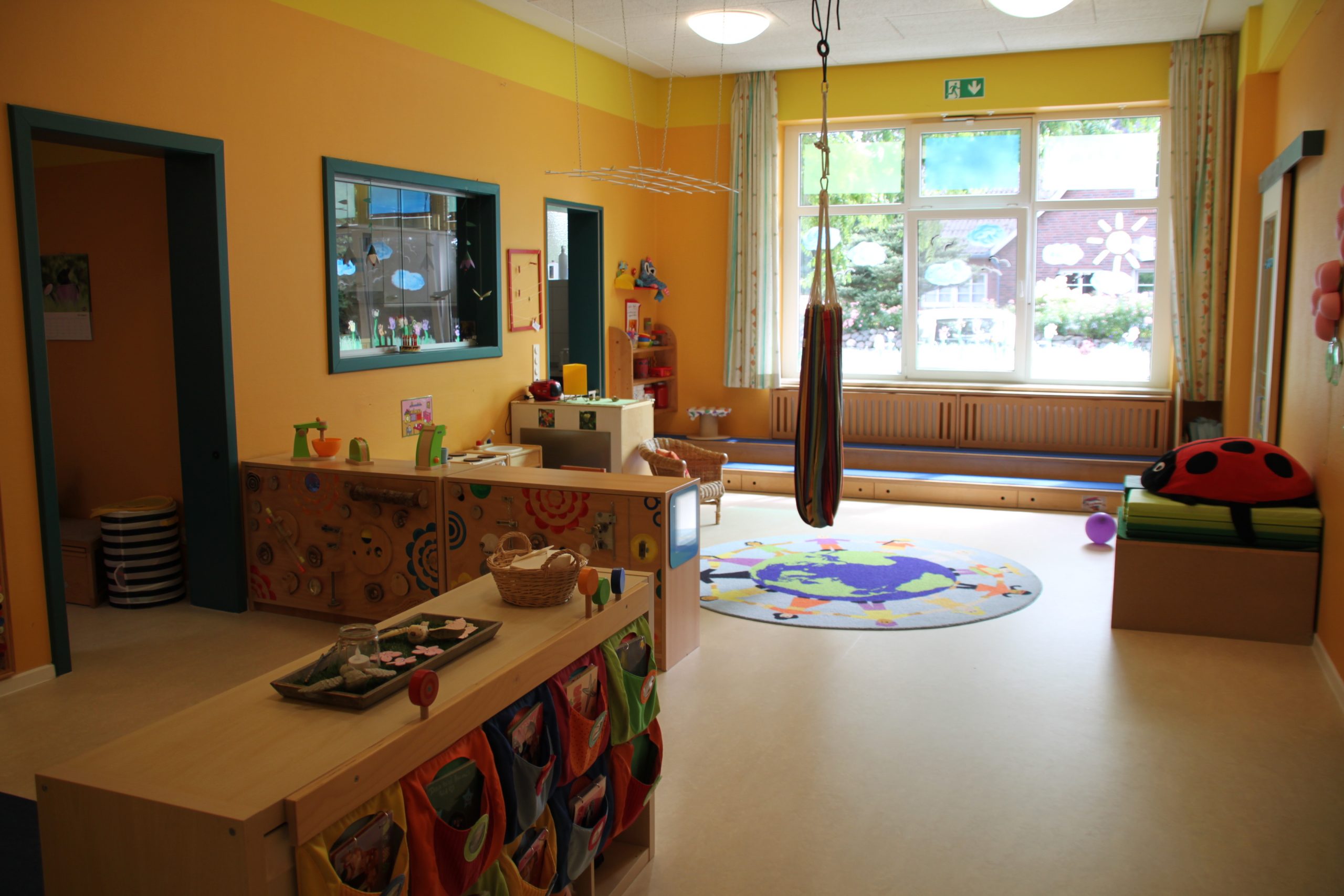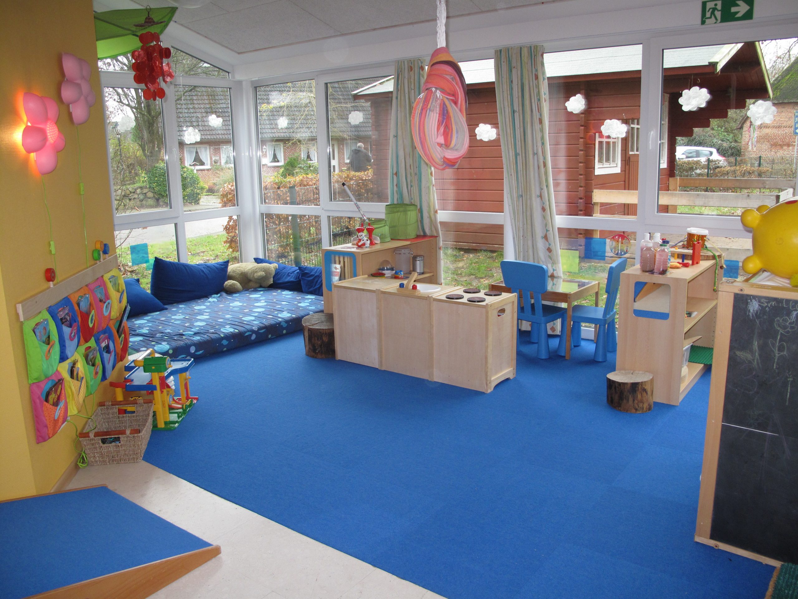 In unserem U3-Bereich stehen zwei neu renovierte Gruppenräume und ein Schlafraum, ein Wickelraum mit der kleinsten Toilette Nordfrieslands, eine Küche und ein Bad zur Verfügung. In den einzelnen Unter3-Räumen befinden sich in Augen- und Krabbelhöhe der Kinder Schatzkörbe mit unterschiedlichen Spielmaterialien. Jedes Kind hat eine Eigentumstasche mit einem Stück von zu Hause, wie z.B. das „Ich Buch“ und Kuscheltiere. Formen und Beschaffenheit des Bodens, des Mobiliars und des Spielmaterials regen die Sinne an und unterstützen die allgemeine Entwicklung. In den Gruppenräumen befinden sich Höhlen, Kuschelkörbchen und Matratzen, als Rückzugs- und Ruhemöglichkeiten. Der Unter3-Bereich kann 20 Kinder aufnehmen.